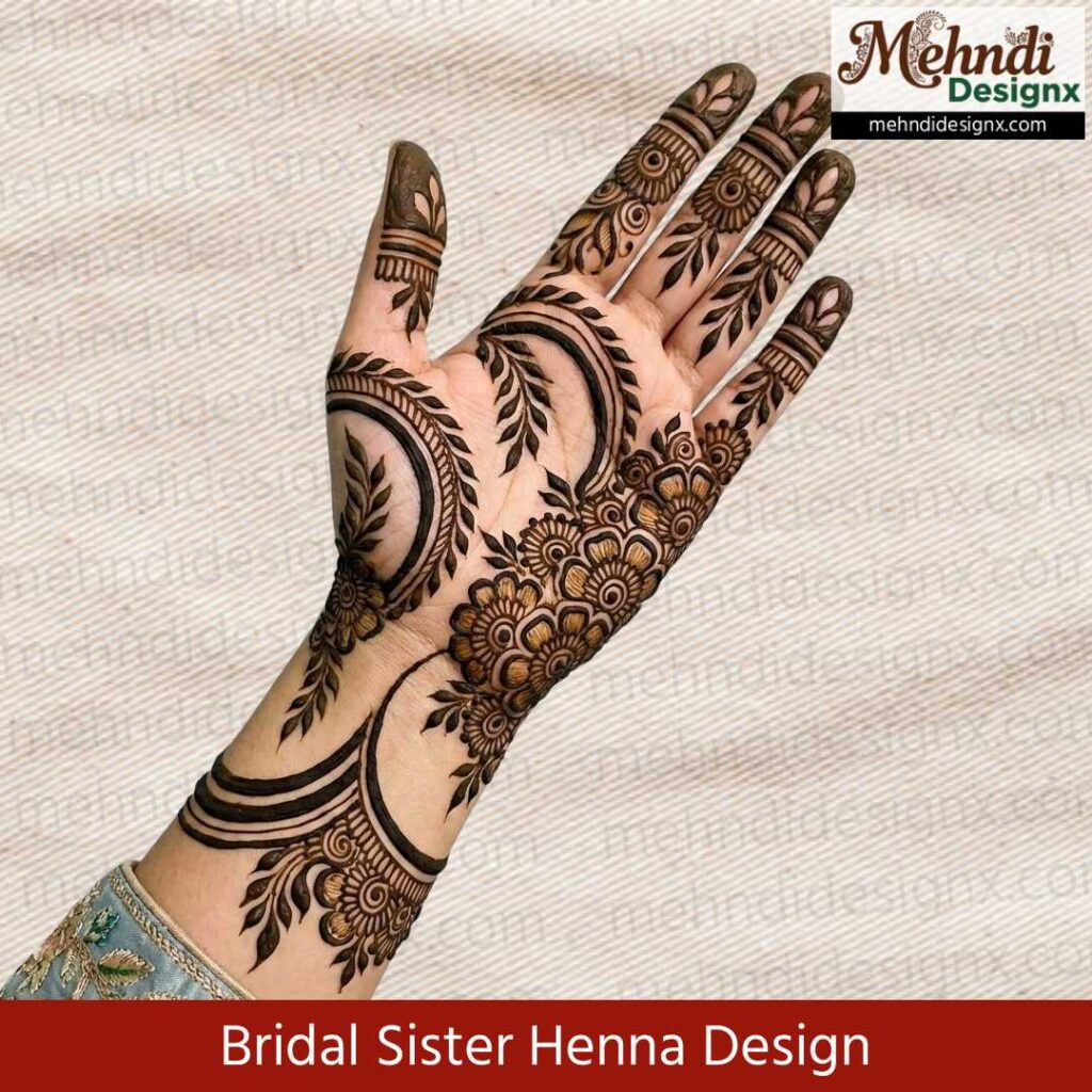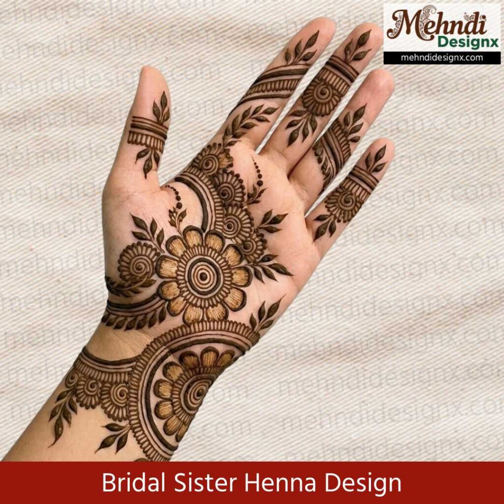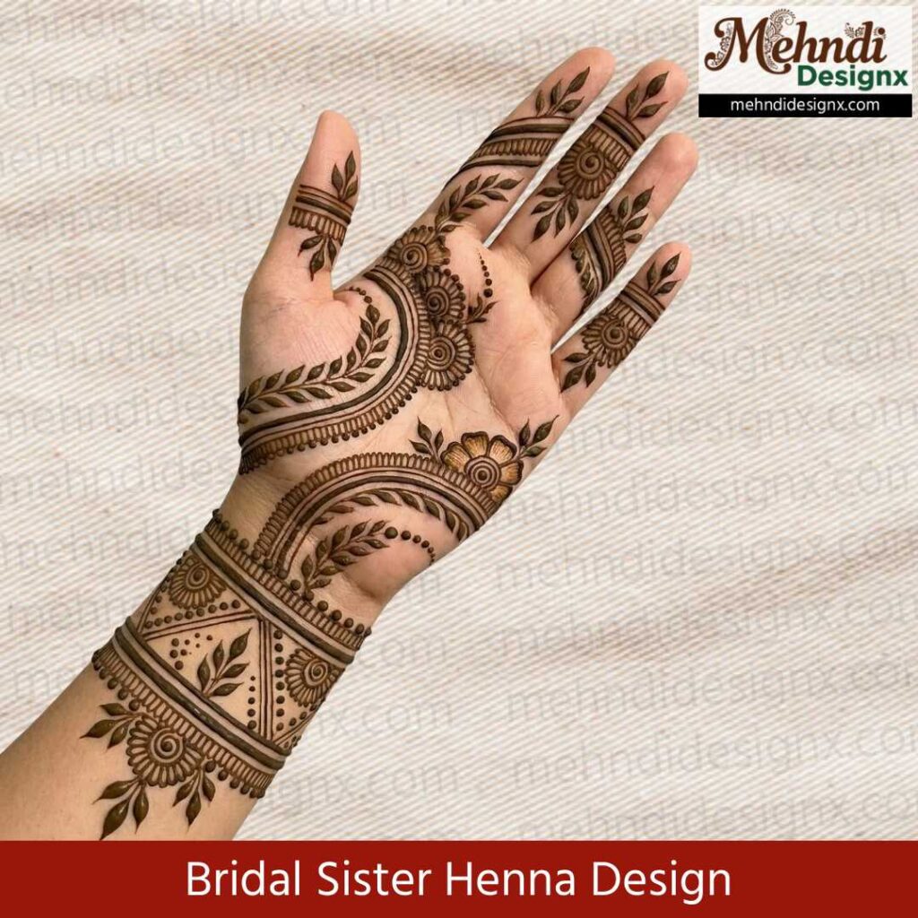 दुल्हन की बहन के लिए यह मेहंदी डिज़ाइन प्यार, नज़दीकी और खुशी का प्रतीक है। न बहुत भारी, न बहुत हल्का—बिल्कुल वैसा जैसा ‘ब्राइड्समेड’ का दिल मुस्कान से भर दे। ये डिज़ाइन हर पल को त्योहारी और हर तस्वीर को यादगार बना देता है।