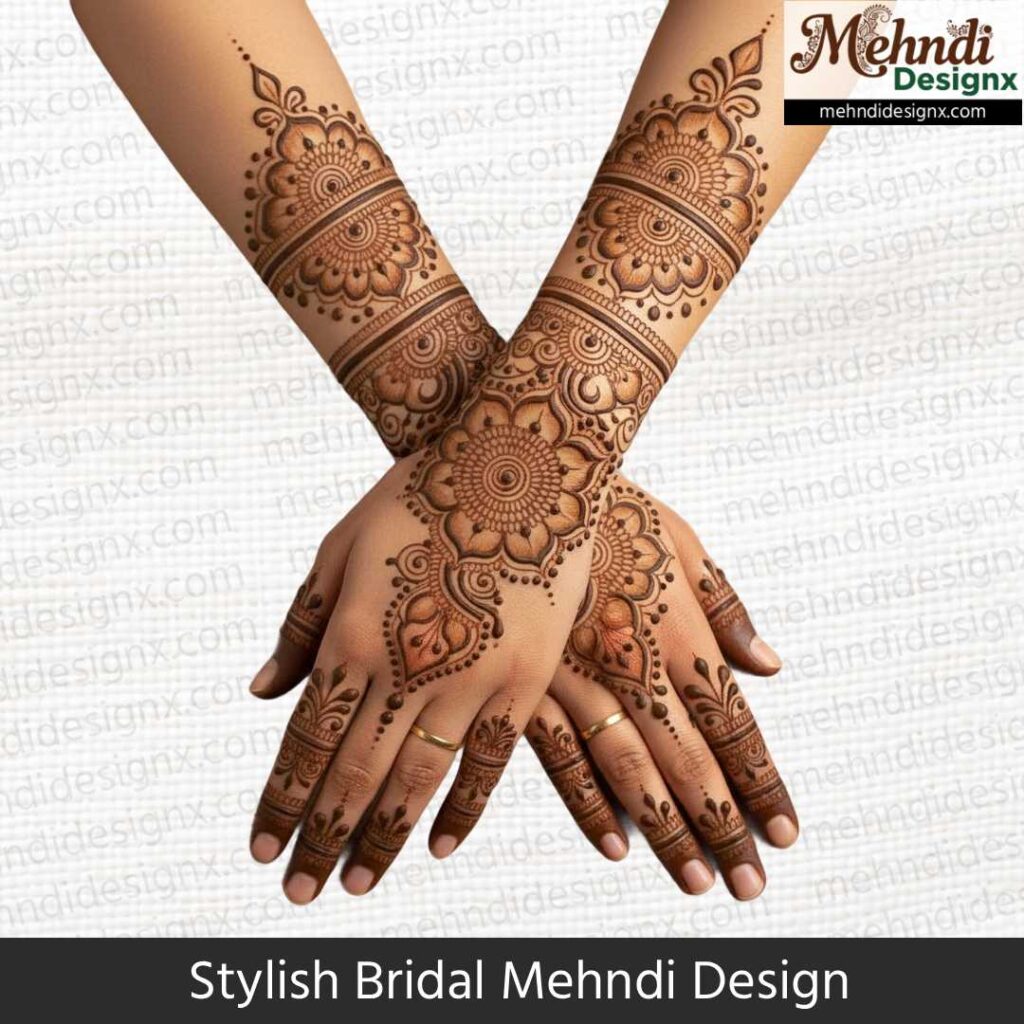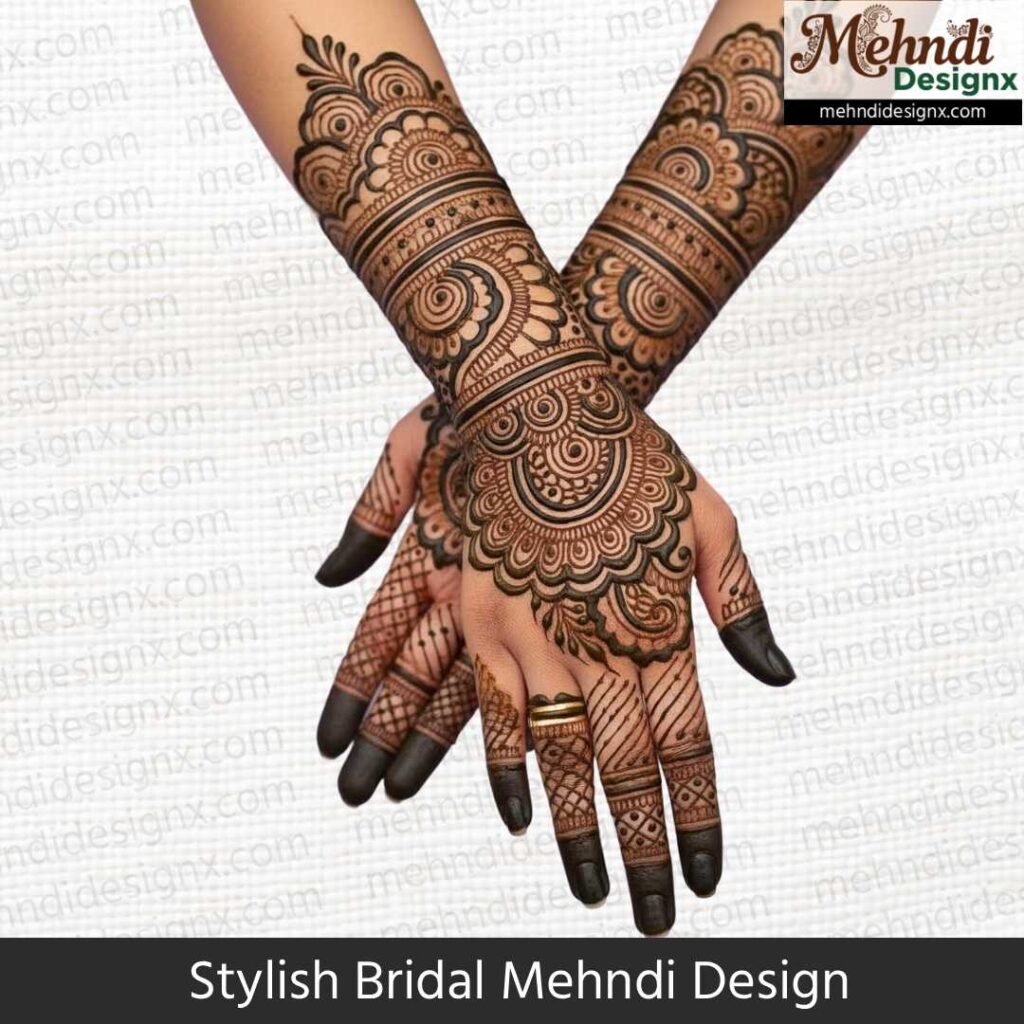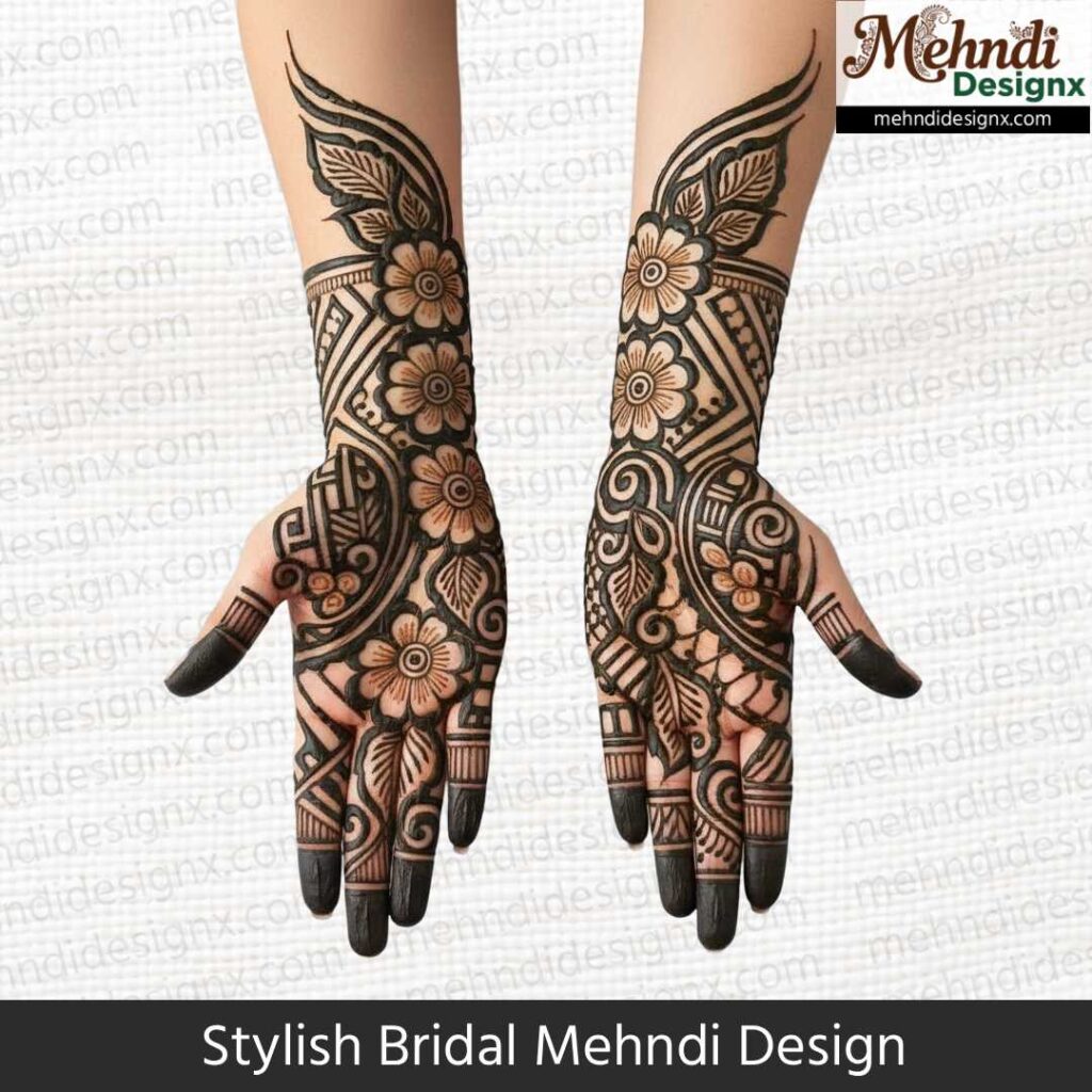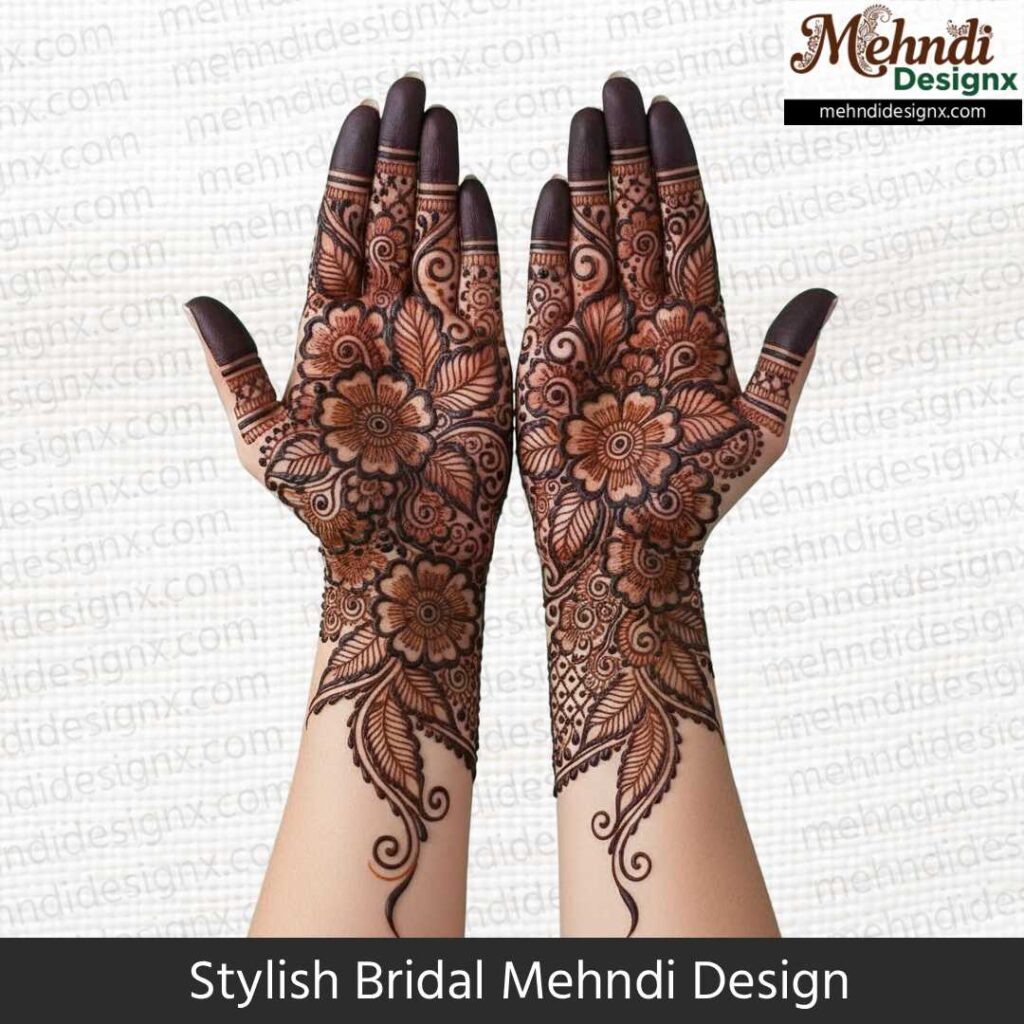 स्टाइलिश ब्राइडल मेहंदी उन दुल्हनों के लिए है जो पारंपरिकता में मॉडर्न टच चाहती हैं। मिक्स पैटर्न, बोल्ड स्ट्रोक्स और यूनिक डिज़ाइन इसका खास आकर्षण है। ये मेहंदी शादी की हर तस्वीर में दुल्हन को ट्रेंडी, ग्रेसफुल और बेहद स्टाइलिश लुक देती है।