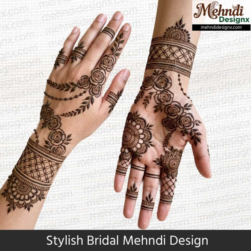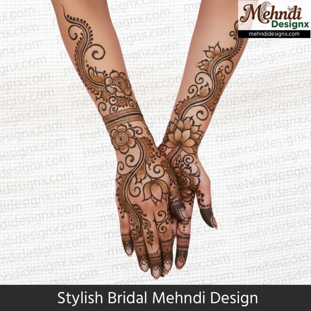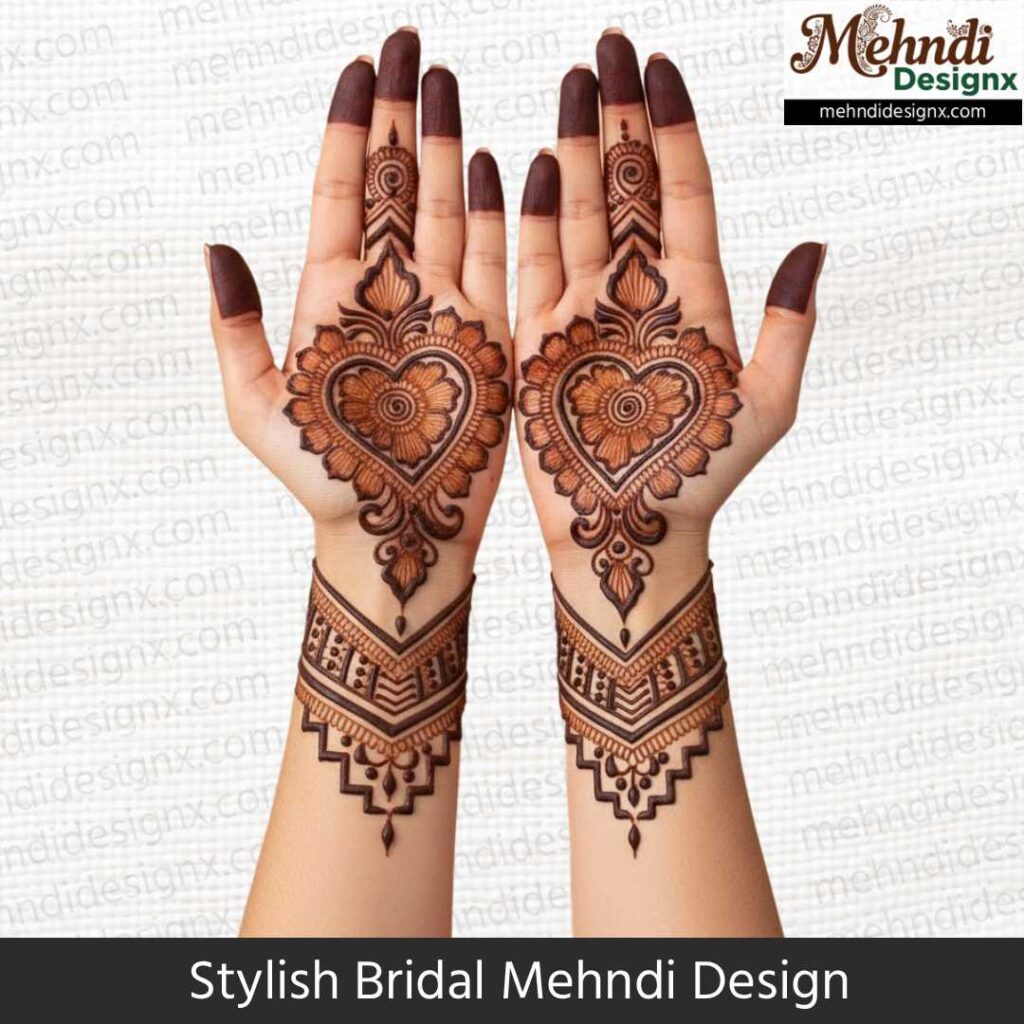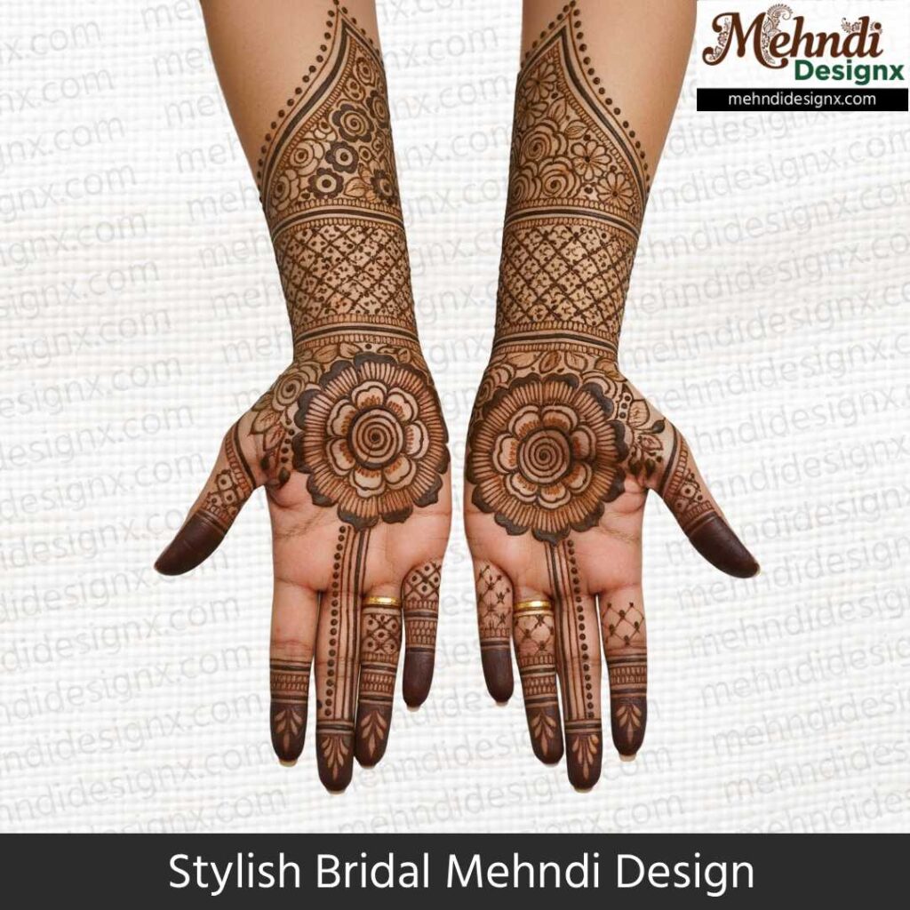 स्टाइलिश ब्राइडल मेहंदी उन दुल्हनों के लिए है जो पारंपरिकता में मॉडर्न टच चाहती हैं। मिक्स पैटर्न, बोल्ड स्ट्रोक्स और यूनिक डिज़ाइन इसका खास आकर्षण है। ये मेहंदी शादी की हर तस्वीर में दुल्हन को ट्रेंडी, ग्रेसफुल और बेहद स्टाइलिश लुक देती है।