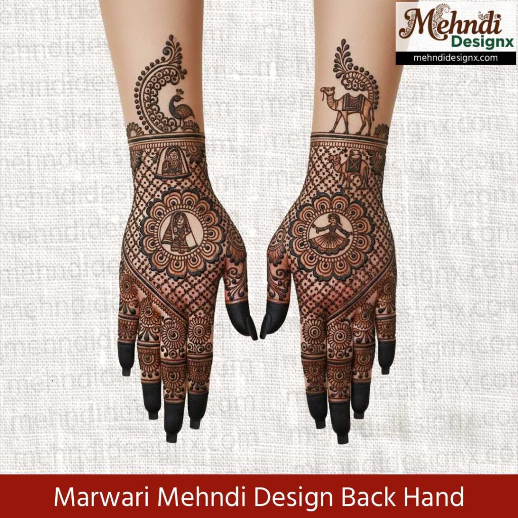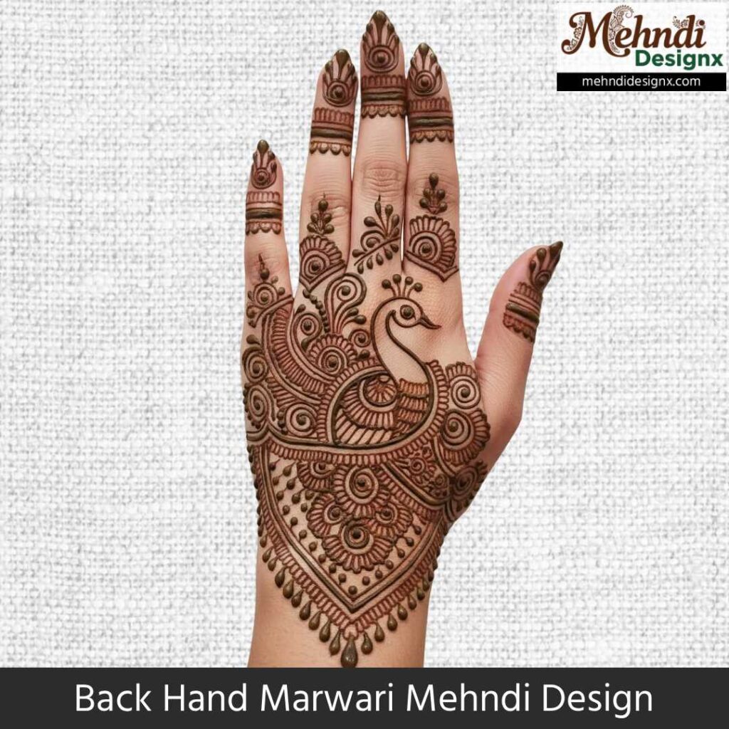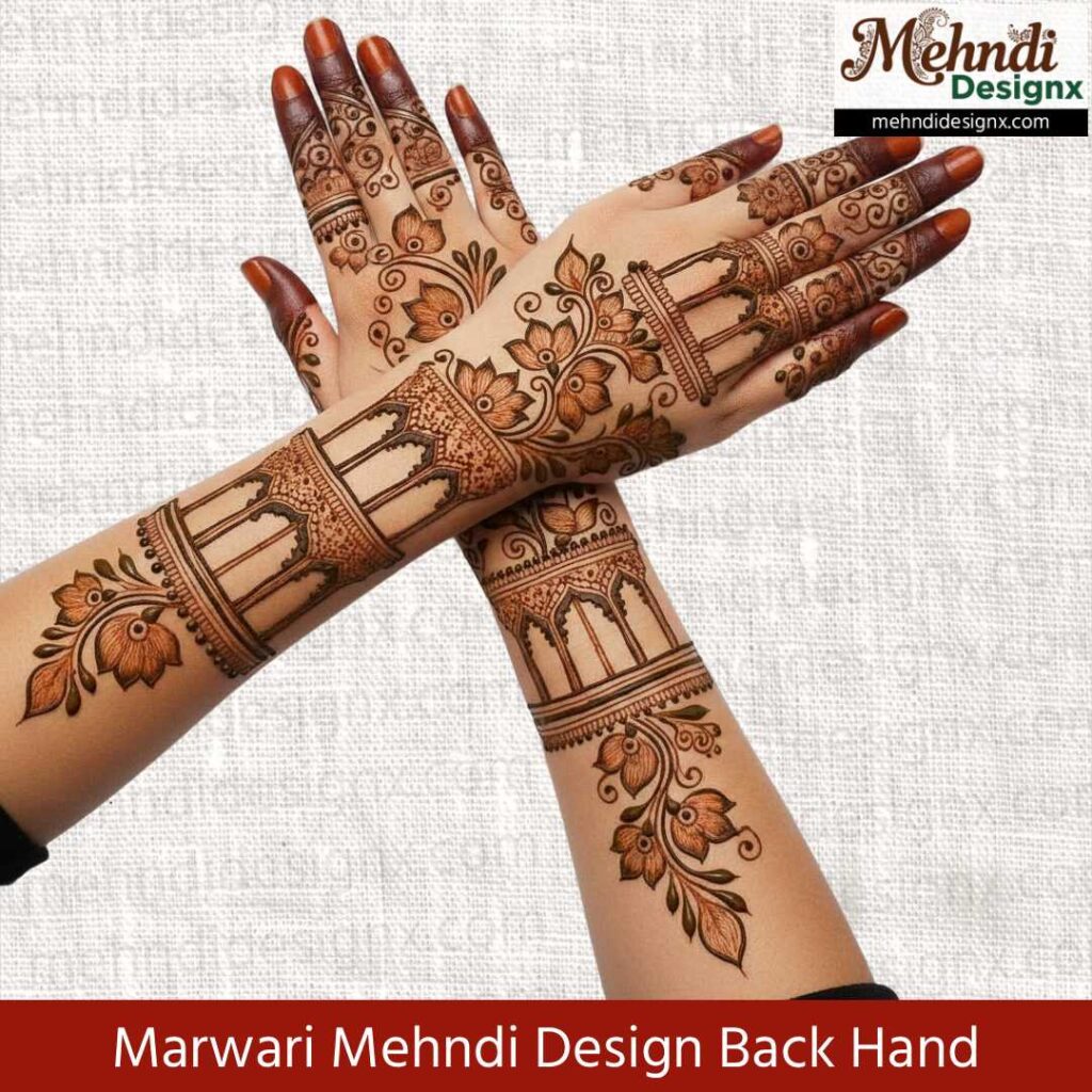 बैक हैंड की खूबसूरती को शाही अंदाज़ में सजाने वाले ये डिज़ाइन्स मरवाड़ी कला की गहराई को बारीकी से दर्शाते हैं। उंगलियों की नाज़ुक लकीरों से लेकर कलाई के खूबसूरत पैटर्न तक, हर स्ट्रोक में एक पारंपरिक कहानी छिपी है।