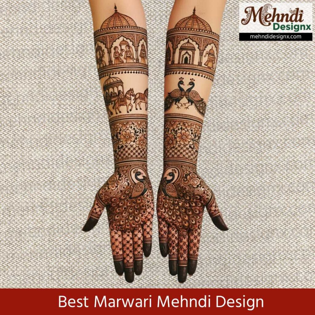 फुल हैंड मेहंदी की भव्यता को मरवाड़ी परंपरा के साथ जोड़ते ये डिज़ाइन हर दुल्हन और हर खास अवसर के लिए शानदार विकल्प हैं। कलाई से लेकर कोहनी तक फैली बारीकी और मोटिफ़्स की गहराई इन डिज़ाइन्स को सचमुच यादगार बनाती है।
