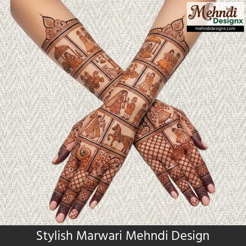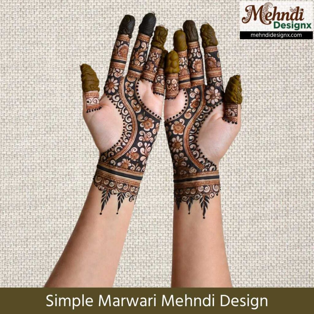Simple Marwari Designs तब बेहद प्रिय होते हैं जब समय कम हो, लेकिन दिल फिर भी सौंदर्य की पूरी अनुभूति चाहता हो। हल्की बेलें, फूल-पत्तियाँ और छोटी-सी जाली – ये सब हाथों में एक सादगी भरी सुंदरता भर देते हैं। ऐसे डिजाइन छोटी रस्मों, तीज या दोस्तों की शादी के लिए परफेक्ट होते हैं। ये simplicity में वो charm लाते हैं जो दिल को शांत भी करता है और खुश भी।
