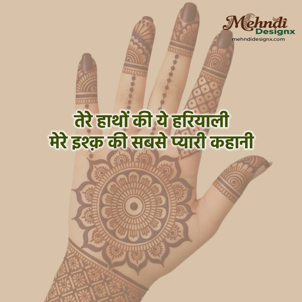 दो पंक्तियों में मेहँदी की पूरी कहानी समेटती ये शायरियाँ दिल को छू जाती हैं। छोटी सी, पर इतनी गहरी कि आँसू और मुस्कान एक साथ आ जाएँ। मेहँदी का रंग और प्यार का संग, बस दो लफ्जों में।